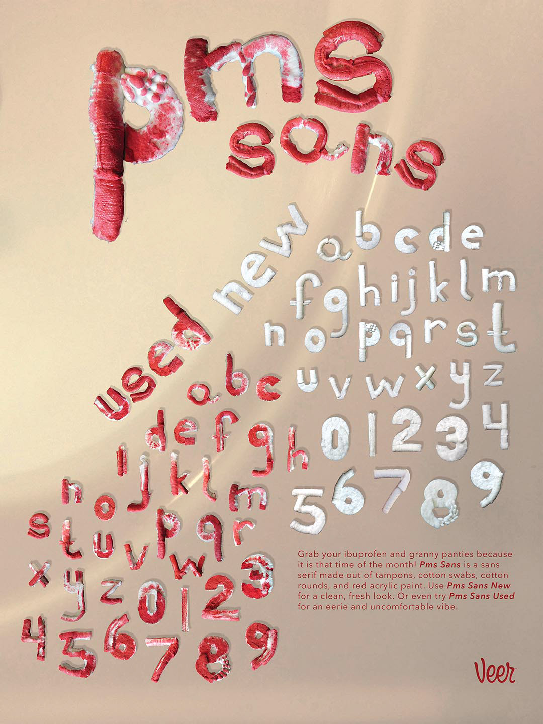 For my typeface I used: tampons, cotton swabs, cotton rounds, and red acrylic paint. Based on my found objects, and help from my classmates, the name of this typeface is
